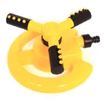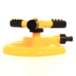 This yellow disc base sprinkler – a decorative garden sprayer, rotates 360° and offers two spray modes – straight and oblique – for flexible watering. Each spray bar is equipped with four nozzles at different angles, ensuring that the water flow is evenly distributed throughout the garden. Inspired by the propeller design, the three-way layout maximizes coverage and irrigation uniformity. Made of high-quality ABS material, the streamlined ground-hugging base works reliably on any terrain.